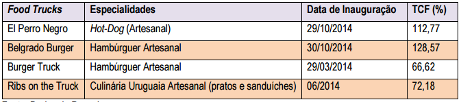 Alguns Food Trucks que foram encontrados não puderam ser avaliados em termos de variação do faturamento por alguns motivos específicos que pudessem enviesar a pesquisa. Por exemplo, o Chilli na Rua é um Food Truck que não está em atividade com frequência regular, pois seu proprietário utiliza a capacidade ociosa de outro empreendimento (restaurante) para “tocar” o Food Truck. Os Food Trucks Açaí da Capital, Açaí Trucke Mix Açaí comercializam um produto muito sazonal, portanto não pode ser analisado devido ao pequeno período de análise. A Kombinni Coffee Truck não possui nenhum tipo de controle do faturamento, logo não é possível obter os dados para o cálculo da TVF. Os Food Trucks Shukran Rock & Food e o Raf Food Truck fizeram pausa de atividade no período definido para análise por motivos de saúde de sócios e familiares. Logo não se obtiveram os dados necessários para a análise. A Komboleria fez uma pausa no mês de dezembro de 2014 para reforma do Truck, portanto o cálculo da TVF no período definido para pesquisa poderia enviesar a TVFM. O Corujinha Food Truck deixou de atuar dentro do modelo de negócio dos Food Truck para desenvolver um novo projeto chamado “Corujinha On the Road” e viajarão pelo mundo com o objetivo de conhecer pessoas, lugares, culturas, comidas, etc.