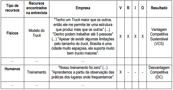 Além disso, na classificação dos Recursos Competitivos nas Empresas, em termos de Vantagem Competitiva Sustentável (VCS), Vantagem Competitiva Temporária (VCT), Paridade Competitiva (PC) e Desvantagem Competitiva (DC), evidenciou-se um total de vinte e cinco recursos nas quatro empresas estudadas. Desse total, constatou-se que dez apareceram em pelo menos duas organizações, sendo sua maioria de capital físico. Esses recursos foram: modelo do truck, matéria-prima exclusiva, geração de energia, equipamentos, network, conhecimento técnico dos funcionários, bom atendimento, receita própria, reputação da empresa e investimentos.