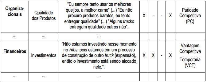 Por fim, utilizou-se das informações obtidas na entrevista por meio de uma categorização a partir das dimensões concorrência, desempenho e recursos (capital físico, capital organizacional, financeiro) descritos no Anexo 1, e foi feita uma comparação entre os estabelecimentos estudados a fim de atingir o quarto objetivo específico da pesquisa.