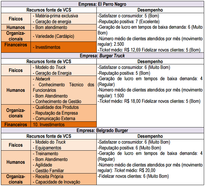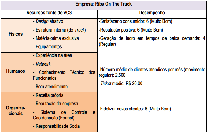 Observaram-se também duas empresas, O Ribs On The Truck e Burger Truck, que tiveram um maior número de recursos geradores de VCS em comum. Foram identificados nestes dois empreendimentos, network, conhecimento técnico dos funcionários, bom atendimento e reputação da empresa como recursos fonte de VCS. Observa-se que dentre as quatro empresas estudadas, estas possuem um tempo maior em atividade, portanto atenta-se para uma possível relação que pode ser explicada pela ambiguidade causal de recursos como network e reputação da empresa que dependem do tempo para sua construção (Barney, 1991).