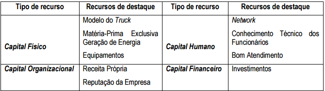 Dentro das organizações estudadas, foi identificado um total de 25 recursos, sendo que 10 deles se destacaram por estarem presentes em duas ou mais organizações. Os principais recursos foram: modelo do truck, matéria-prima exclusiva, geração de energia, equipamentos, network, conhecimento técnico dos funcionários, bom atendimento, receita própria, reputação da empresa e investimentos.
