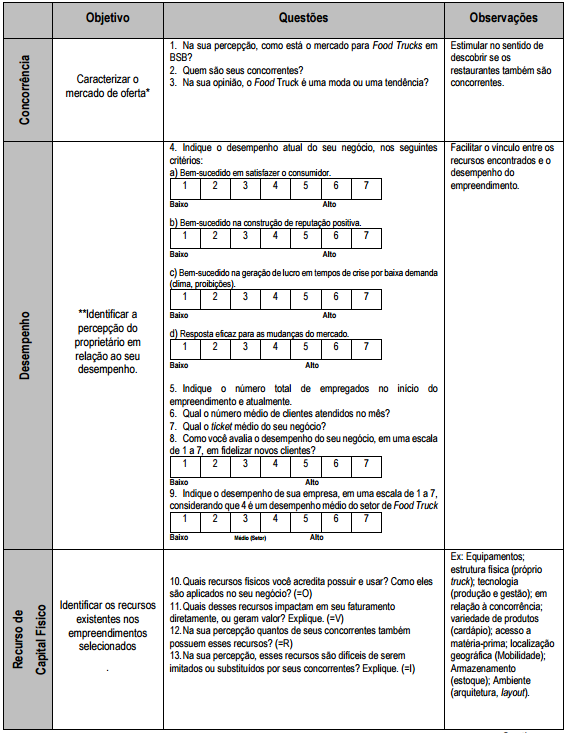 Logo, por se tratar de um modelo de negócio tão recente no país, existe uma carência de estudos que visam compreender melhor esse tipo de empreendimento. Logo, o presente estudo tem como objetivo identificar os recursos que são a fonte de vantagem competitiva sustentável, possibilitando aos Food Trucks desempenho acima da média. Para alcance desse objetivo geral, esta pesquisa teve os seguintes objetivos específicos: i) caracterizar o mercado de oferta de Food Trucks na cidade de Brasília; ii) selecionar, dentro do universo de Food Trucks encontrados, os empreendimentos que obtiveram desempenho (faturamento) acima da média por meio da TVF – Taxa de variação do faturamento; iii) Identificar os recursos existentes nos empreendimentos selecionados; e iv) identificar recursos estratégicos comuns aos empreendimentos que obtiveram alto desempenho.