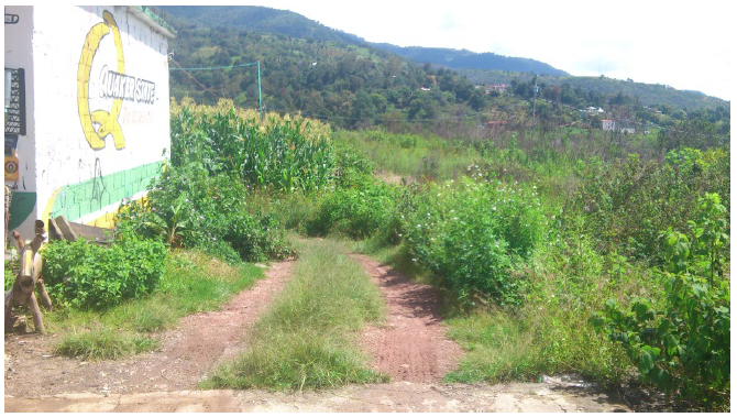 El polígono del terreno no está contemplado en el área urbana actual que señala el Plan Municipal de Desarrollo Urbano. El uso de suelo que le corresponde al sitio donde se planea crear el Parque Ecoturístico es: AG-BP-TM (Agropecuario de baja productividad por temporal). El Plan Municipal de Desarrollo Urbano de Almoloya de Alquisiras, así como cualquier otra normatividad, no establecen criterios que impidan el aprovechamiento de esta zona con fines ecológicos. El predio está ubicado a un costado de la carretera La Puerta-Almoloya de Alquisiras, en la Colonia Cuarta Manzana. Dicha carretera cuenta con dos carriles (uno por sentido). El ancho promedio de esta vía es de 8 a 9 m. Esta carretera es la única forma de acceder al predio, pues el terreno se encuentra en una cañada (imagen 6). La accesibilidad al predio en la actualidad sólo se puede realizar caminando en un trayecto de aproximadamente 80 m. Debido a que no se ha realizado por el momento la apertura de una calle (Ilustración 7).