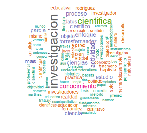 Este resultado se ha obtenido a través de la programación en RStudio de un algoritmo para conformar una nube de palabras representativa del contenido de la primera parte de la ya referida Tesis de segundo grado del autor del presente trabajo. Obsérvese que con este gráfico se pudieran hacer valoraciones preliminares acerca de las principales categorías del marco teórico-referencial asumido (a manera de empleo de la modalidad investigativa de teoría fundamentada, del enfoque cualitativo). Al mismo tiempo, se puede prestar la atención a los autores más referidos en esa parte del documento, lo cual anticipa la posibilidad de trabajar también análisis bibliométricos, otra arista importante de la actividad científica.