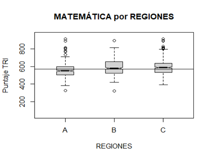 Se comenzará con la utilización de una gráfica de caja y bigotes (o boxplot) para mostrar el comportamiento de los resultados de una cierta prueba de logro (en este caso de Matemática) por regiones geográficas. El resultado gráfico es el siguiente: