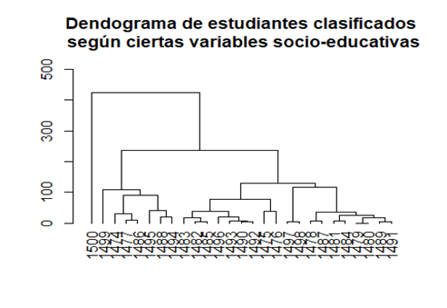 Obsérvese en ella que los estudiantes de la submuestra seleccionada han sido agrupados ordenadamente en clústers jerárquicos, en tanto sus medidas de distancia euclídea resulten más parecidas. Así, los estudiantes de las filas números 1479 y 1480 son, sin discusión, los de comportamiento más próximo (en relación con las variables consideradas en el nuevo data frame), como mismo el educando de número de orden 1500 es el que más se diferencia de los restantes, en ese colectivo.