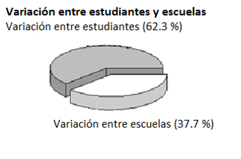 Como habrá podido apreciarse en la devolución estadística anterior, el resultado del cálculo del ICC, para los resultados de los logros del aprendizaje en Matemática de los 1500 estudiantes, de las 178 escuelas de la muestra seleccionada, representa un valor mayor que cero (0.3772542); puede afirmarse, entonces, que el 37.7% de la varianza total de esos puntajes es atribuible a variaciones entre escuelas y que, por tanto, no toda la varianza total depende de las diferencias personológicas de los estudiantes. En términos gráficos sería como sigue.