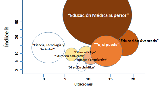 La representación del tipo bubble (o gráficos de burbujas) obtenida está indicando que la línea “Educación Médica Superior” es, por mucho, la de mejores resultados pues, con una cantidad considerable de documentos y de citas anuales, ha conseguido una acumulación mayor de citaciones y de productividad bibliométrica, en términos de “Índice h”. Le continúan, en ese orden, las líneas: “Educación Avanzada”, “Yo, sí puedo” y “Educa a tu hijo”. No menos meritoria ha sido la producción documental de “Ciencia, Tecnología y Sociedad”, que ha alcanzado un “Índice h” a pesar de no tener muchas citas, ni documentos producidos.