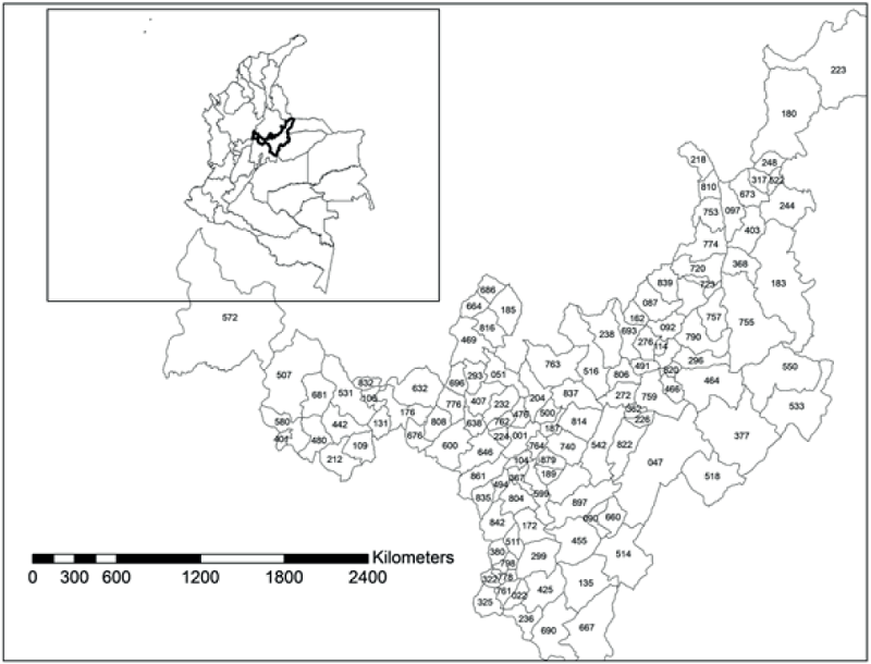 To calculate gravitation forces in this exercise, two masses are assumed for the launching process. Firstly, agricultural production measured in ton interacts by interacts with population of towns, as a proxy for dimension of local markets. On the other hand, the distance between the masses is determined by geo-statistical tools. Geo-referenced and geo-statistical processes were carried out in software ARC GIS. Data were collected from the webpage of Colombian geographical office (IGAC), from Colombian statistical office (DANE) and from Ministerio de Agricultura y Desarrollo Rural (1997), including 119 municipalities.