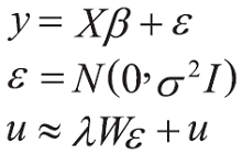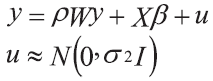 Where: y is a vector (Nx1), Wy is a spatial lag of variable, X is the exogenous variables matrix, u is a white noise error term, N is the number of observations and p is a autoregressive parameter.