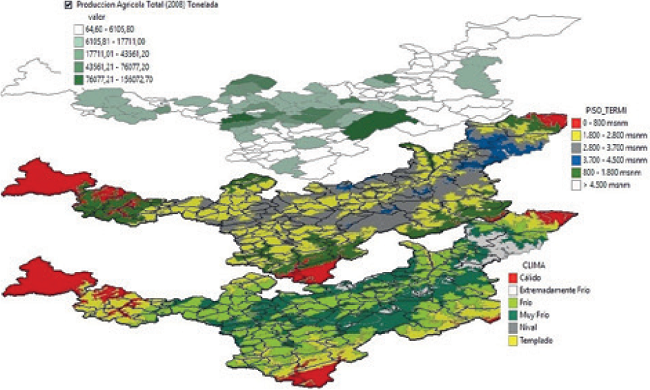 As showed in Figure 1, it is clear that the geographical conditions of the state suggest a predominant presence of high lands and cold climates that propitiate the development of agricultural crops, adequately adapted to such conditions. In spite of the importance of cold climate production, we can also find a broad variety of climates and natural environments that stimulate the production of other commodities. So, from the outset we can presume the remarkable role of agriculture in the state's economy.