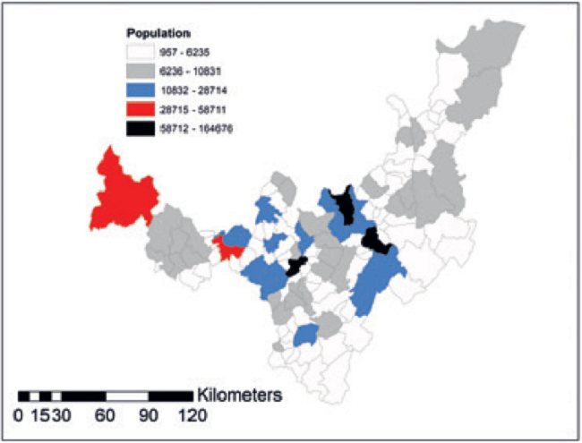 Most of the towns in Boyacá have a relevant rural predominance, and cities concentrate urban activities. Figure 2 shows more populated municipalities. Tunja represents the administrative and urban center of the whole region and concentrates bureaucratic, administrative, educational and financial activities. Secondly, other cities of a smaller size are, namely: Sogamoso, Duitama, Chiquinquirá and Puerto Boyacá.