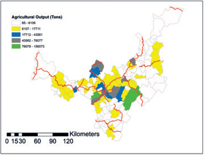 Results of gravitation model depict concrete spatial zones located near to urban centers that spur agricultural output. The intensity of spatial dynamics reveals that urban markets and important producers of agricultural commodities are located in short distances and are connected by relatively well paved roads.