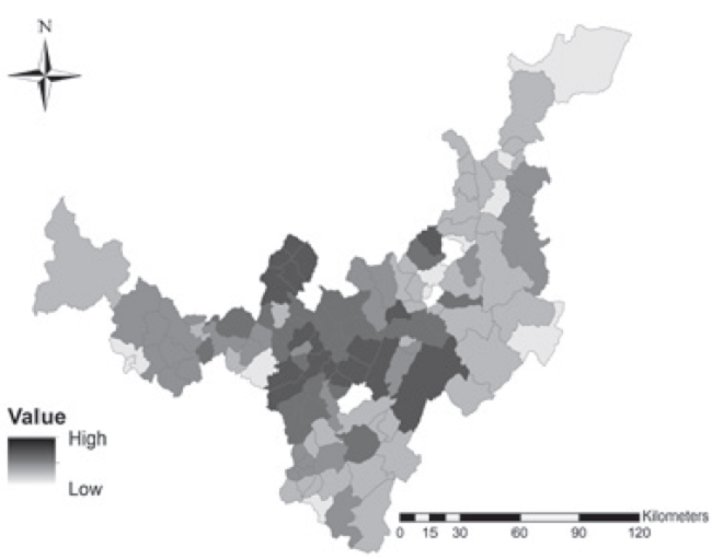 Analyzing 119 municipalities, we generated a spatial weight matrix (W) defining the kind of spatial interaction as queen. So the direction of spatial association flow is similar to the queen movement in chess.