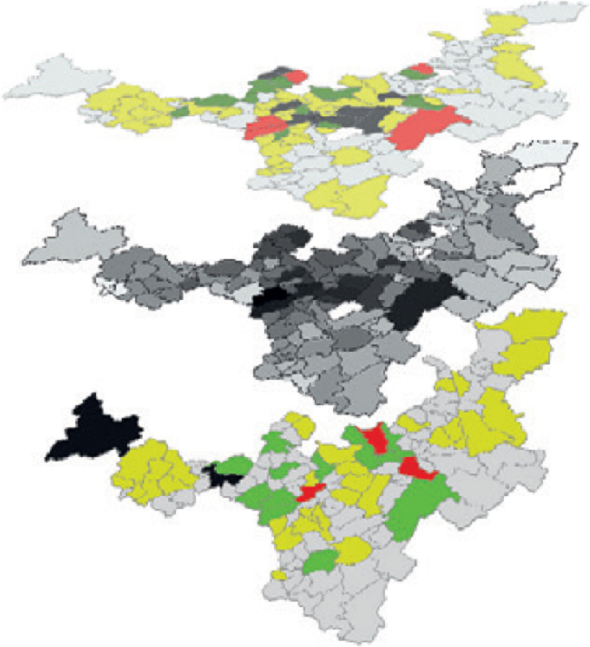 A combination of three layers displayed previously is rendered now in Figure 5. Higher and lower maps render the local values for agricultural output and population, respectively. But the interesting information is rendered in the intermediate map, because it represents the outcomes turned out from the gravitation formula [1]. There can be appreciated more clearly the influence of the masses (output and population) on the results of gravitation model, and there also appear some insights about the distance between municipalities. It is exhibited there the most important zone in terms of spatial interaction around Boyacás main city. According to the results, important agricultural points are concentrated geographically in the state looking for supplying strong outer demand.