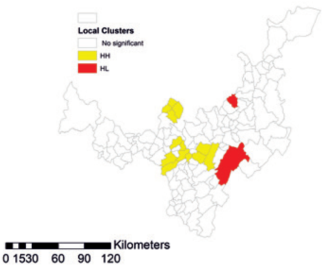 Concomitantly, the LISA map exhibits some clusters, indicating the behavior of values of variable for those places depending on the case. Our results corroborate the existence of a cluster of variable high values in the central corridor of the state and in peripheral zones of municipalities with low agricultural production, which are surrounded by others with similar features.