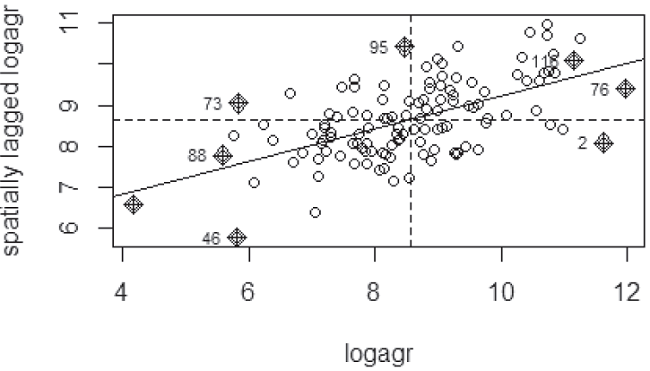 In Figure 7 is showed the Moran Dispersion Diagram representing in two axes the values of the logarithm of agricultural production and in the other hand, the spatially lagged value of the same variable. The diagram shows a positive relationship, suggesting the existence of spatial autocorrelation in our variable of interest. According to Chasco (2003), the slope of regression line corresponds to statistic of Moran, concomitantly, more open the angle formed with the abscise, highest degree of spatial autocorrelation.