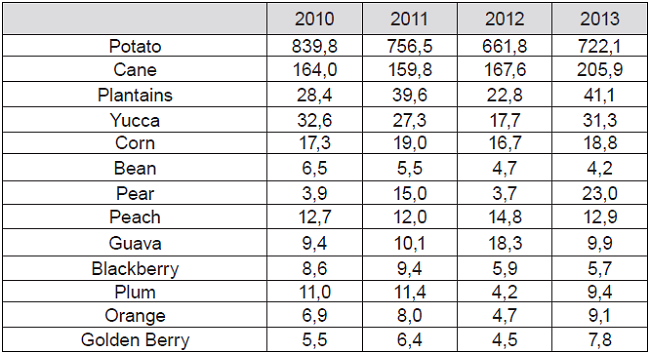 In fact, it is used that small peasants alternate crops of potato with others of corn, beans, peas, wheat and barley (Rodríguez & Bermúdez, 1997). Such multi crop system reduces the economic risk for small farmers and offers food for self-consumption of peasant's family. On the other hand, the main fruit crops are: guava, orange, pear and plum. Moreover, the region is the leading producer of deciduous fruits due to its aptitude in plain lands, mainly in towns as Nuevo Colón.