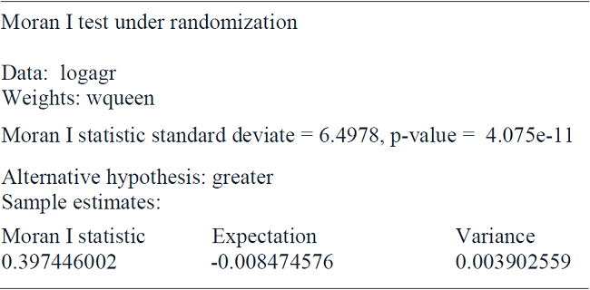 The Moran test of spatial autocorrelation makes up a very standard contrast for verifying spatial dependence. For such purpose the null hypothesis is defined in terms of absence of spatial autocorrelation and in case of rejection, there would be evidence that values prevalent in a specific geographical entity depend on the behavior of variable in neighboring spaces. For our purposes, the Moran test rejects the hypothesis of the no existence of spatial dependence in our endogenous variable agricultural production.
