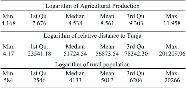Exogenous variables have a close relationship with agricultural output and all of them are significant. Rural population shows an important explanatory capacity because commodities are offered at the local level, mainly if towns are barely communicated. A geographical variable is represented by distance regarding Tunja, the main city of Boyacá, and shows the projection to urban markets. According to Arfa et al. (2010) a topographic variables can represent local relief.