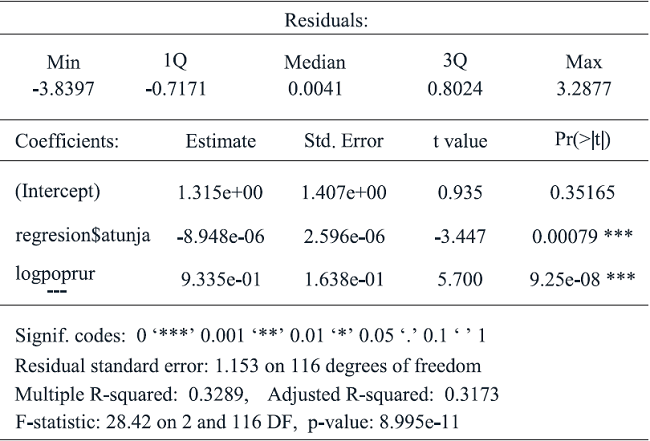 In this case the regression equation is similar to the conventional technique by OLS and results are shown in Table 4, which indicate the basic behavior of the model. Value of adjusted R2 0.328 suggests that the fit of model not jet includes relevant information about some explicative variables on model, but it is an acceptable value in cases of models with cross section or data panel arrangement. Both exogenous variables turn out significant.
