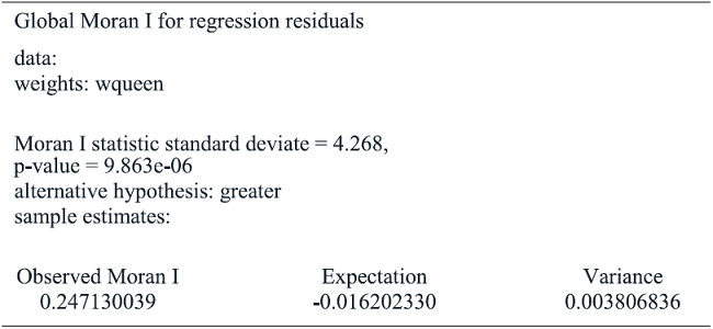 In equation [4] can be observed that if spatial lag is omitted in exogenous or endogenous variables, the feature of spatial dependence will be transmitted to error term, in a case quoted as substantive spatial autocorrelation. To handle this case, it is necessary to include a spatial lag of dependent variable with spatial autocorrelation (Moreno & Vayá, 2002).
