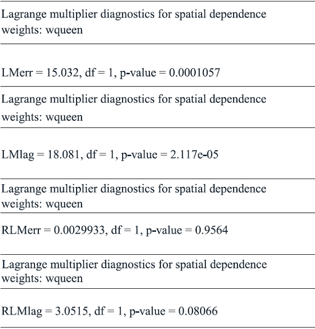 The next step consists in applying standard Lagrange Multiplicator contrasts for corroborating the presence of spatial autocorrelation, and to determine criteria for evaluating the pertinence of a spatial lag or spatial error patterns in order to define the kind of spatial dependence. In case of dubitation, robust Lagrange Multiplicator contrast is promptly performed.