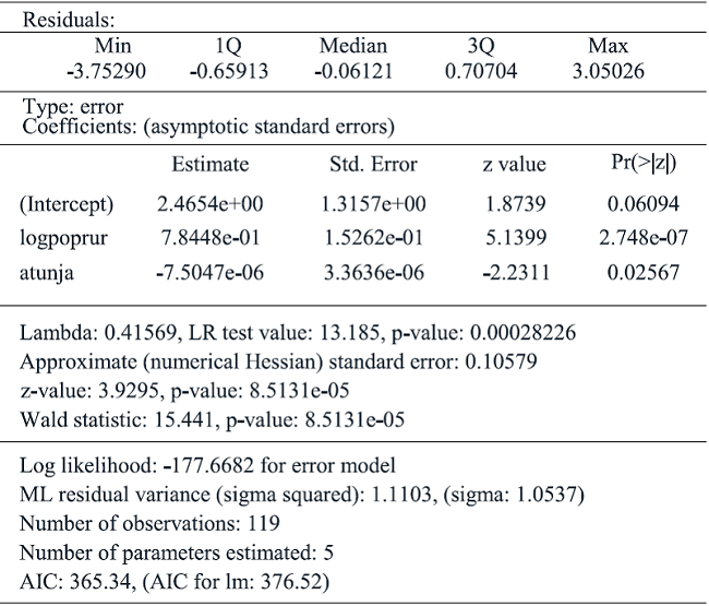 In tables 7 and 8 are presented two results of models, the first one corresponding to the case of the spatial error model and the second reports spatial lag model.