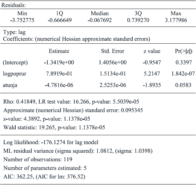 The Table 6 shows the contrasts commonly used for choosing the correct structure of spatial dependence. In doing so, two additional tests help to understand the character of spatial dependence: LMlag and LMerr tests which indicate the significant results in the case of spatial lag model. The right choice of spatial dependence is crucial for analysis provided that this decision could conduct to diverse interpretation of the spatial dependence.