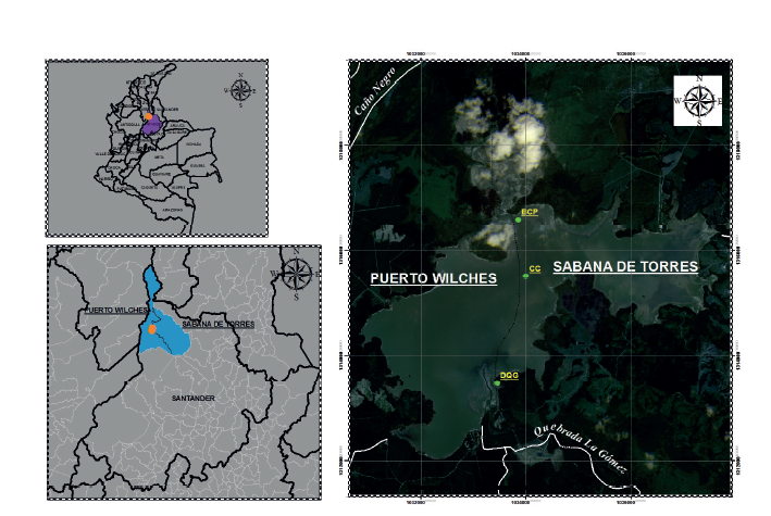 Ubicación de la ciénaga de Paredes entre los municipios de Sabana de Torres y Puerto Wilches, departamento de Santander (Colombia) y las estaciones de muestreo.
