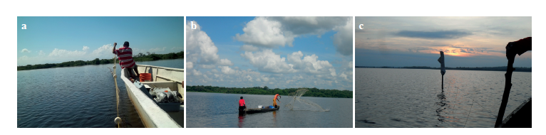 Aparejos de pesca utilizados: a) red estacionaria, b) atarraya y c) línea de anzuelos.