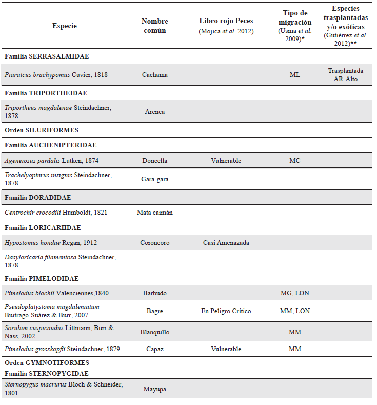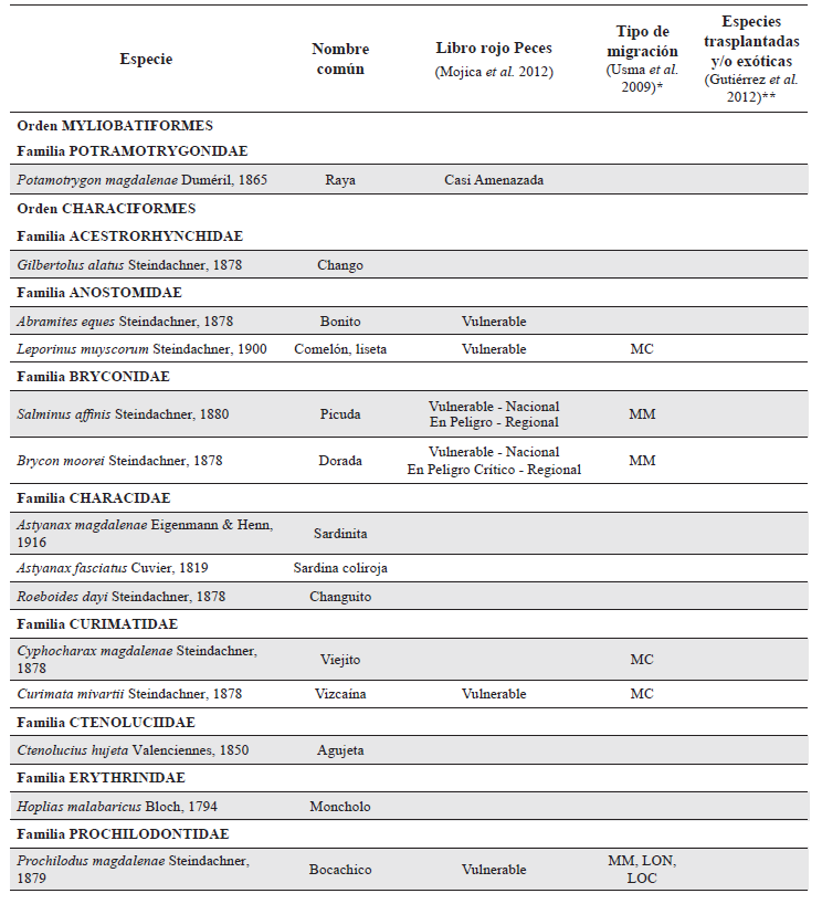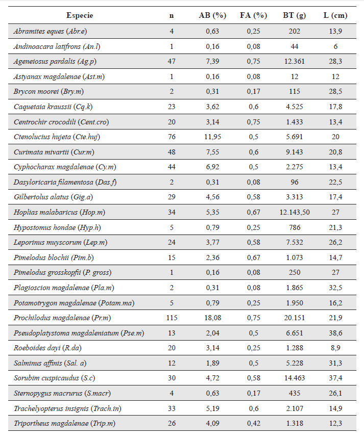En total (incluyendo las capturas con todos los aparejos de pesca) fueron capturados 762 individuos, pertenecientes a 29 especies, 18 familias y 6 órdenes (Anexo 1). Entre las especies capturadas, 67 % fueron Characiformes, 28 % Siluriformes, 4 % Perciformes y 1 % de otros órdenes (Gymnotiformes y Myliobatiformes). Todas las especies capturadas son típicas de la cuenca del Magdalena (Dalh 1971, Mojica 1999, Galvis y Mojica 2007), aunque se registra la presencia de Piaractus brachypomus, especie no nativa, trasplantada de la cuenca del Orinoco. El 41 % de las especies registradas son de hábitos migratorios (Usma et al. 2009).