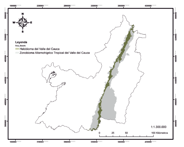 En el departamento del Valle del Cauca, localizado entre los 3°44’11.82” N-76°24’46,02” O (esquina superior izquierda) y 3°41’56,85” N-76°22’14,30” O (esquina inferior derecha) (Parra y Hernández 2010), se encuentra el área de distribución potencial del bosque seco tropical, específicamente sobre el valle geográfico del río Cauca, que cubre toda la zona plana y parte del piedemonte de la vertiente oriental de la cordillera Occidental y la vertiente occidental de la cordillera Central (Reina- Rodríguez et al. 2010, Arcila et al. 2012, Vargas 2012). Esta región comprende los biomas regionales Zonobioma Alternohígrico Tropical del Valle del Cauca - ZAHTVC y el Helobioma del Valle del Cauca – HVC (Figura 1) (CVC y Funagua 2010). El rango altitudinal del área de estudio (ZAHTVC+HVC) se encuentra entre los 892 y 1695 m s.n.m. (Alvarado-Solano y Otero 2015a, Locklin s.f. en: http://www.worldwildlife.org/ecoregions/nt0207), y cubre una extensión de 350.959 ha (Tabla 1).