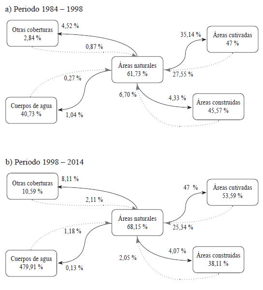 A partir de la matriz de transición se pudo construir un diagrama donde se observa la dinámica de cambio ocurrido entre las áreas naturales y los otros tipos de coberturas (Alphan 2009). Las transiciones de coberturas para los periodos 1984-1998 y 1998-2014 presentan similitudes, especialmente para el caso de las transiciones ocurridas entre áreas naturales – áreas construidas, áreas naturales – otras coberturas, áreas naturales – áreas cultivadas. Para el primer periodo (Figura 2a), alrededor del 60 % de las áreas naturales permanecieron sin cambios. Las mayores pérdidas y ganancias se presentan en relación con las áreas cultivadas y otras coberturas, mostrando una dinámica importante entre estas categorías. Para el segundo periodo (Figura 2b), permaneció el 68 % de las áreas naturales de aquellas que habían persistido en el periodo anterior. Sin embargo, entre 1998 y 2014 las áreas naturales transformadas hacia áreas cultivadas y otras coberturas aumentó reflejando cualitativamente un aumento en la transformación ocurrida en este lapso de tiempo.