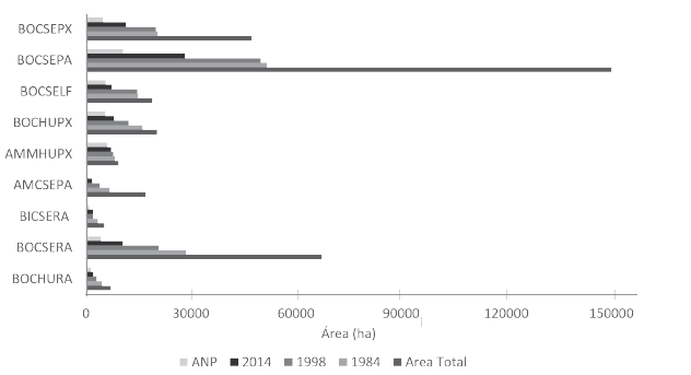 La operación de diferencia en el álgebra de mapas entre los mapas temáticos 1984-1998 y 1998-2014 produjo dos mapas intermedios de áreas naturales, luego estos dos mapas fueron nuevamente procesados en el álgebra de mapas para obtener el producto final donde se reflejaron las áreas naturales que han persistido en la zona de distribución potencial del bioma BsT durante los últimos 30 años. En términos generales, de las 154.777 ha de áreas naturales que se encontraban en la zona de estudio (ZAHTVC+HVC) para 1984, representan el 11,4 % de esta, y corresponde al 26 % de aquellas que han persistido hasta 2014. Las ANP se concentran en AMMHUPX (65 %) y BOCSELF (30 %) del bioma ZAHTVC, y en BOCHURA (19 %) y BICSERA (18 %) del bioma HVC (Figura 3).