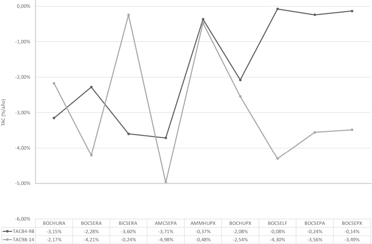 La tasa de transformación por ecosistema (Figura 4) presenta dinámicas diferentes. Los valores más altos se localizaron en los ecosistemas BOCSEPX, BOCSEPA y AMCSEPA del bioma ZAHTVC y BOCSERA del bioma HVC. Adicionalmente, resalta el ecosistema BOCSELF como un ecosistema del ZAHTVC donde la tasa de transformación aumentó en el periodo 1998-2014. Por otro lado se observa una dinámica importante de recuperación de áreas naturales en los ecosistemas BOCHURA y BICSERA del bioma HVC, y AMMHUPX del ZAHTVC, en los cuales la tasa de transformación entre 1984-1998 y 1998-2014 disminuyó.
