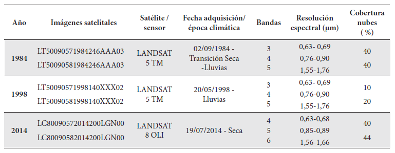 Para la selección final de imágenes a ser utilizadas en la identificación de coberturas, se empleó la combinación de bandas 4-5-3 de las imágenes obtenidas por el sensor TM y TM+, así como una combinación de bandas 5-6-4 para las imágenes del sensor OLI, pues resaltan espectralmente atributos de la imagen que de otra manera no sería posible observar (EEA 1994, Ideam et al. 2007, 2008). Las imágenes fueron procesadas en el software comercial de SIG ArcGis ® 10.2 for Desktop, tipo de Licencia Básica de la empresa ESRI, en el Laboratorio de Sistemas de Información Geográfica (SIG) de la Universidad Nacional de Colombia, sede Palmira. Una vez seleccionadas las bandas se procedió a componer una nueva imagen mediante el procedimiento de Composición de Bandas. Luego, las imágenes de las escenas 9-57 y 9-58 de la misma fecha de adquisición se procesaron para obtener un mosaico que permitiera cubrir la totalidad del área de estudio. El área de estudio delimitada a partir del mapa de ecosistemas se empleó como máscara para recortar los mosaicos obtenidos anteriormente. La información cartográfica y satelital fue proyectada al Sistema de Coordenadas WGS1984 Zona UTM 18N. Dada la persistencia de nubes, la discontinuidad temporal en la captura de la información satelital y la pérdida del 20 % de datos en imágenes adquiridas por el sensor ETM+ por fallas presentadas en el instrumento Scan Line Corrector (SLC) desde mayo de 2003 (Abd El-Kawy et al. 2011), las imágenes con menor cobertura de nubes y separadas por intervalos de tiempo similares, fueron las mejores imágenes para desarrollar este trabajo. La información satelital seleccionada consistió de dos imágenes satelitales Landsat TM5 (Thematic Mapper) y una imagen Landsat 8 OLI (Operational Land Imager) (Tabla 2).