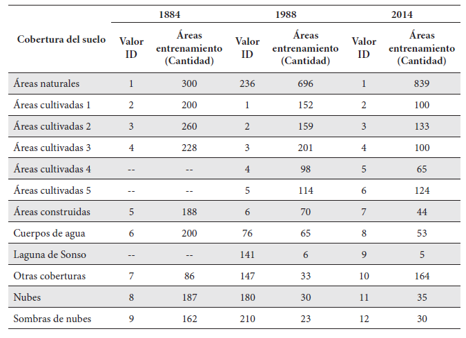 Las áreas cultivadas se diferenciaron de acuerdo a la composición en color de la imagen, reflejando diferentes estados de desarrollo del cultivo de caña de azúcar. En el caso de la Laguna de Sonso, su respuesta espectral en las imágenes de 1998 y 2014 fue diferente al de 1984 y diferente a otros cuerpos de agua (por la acumulación de materia orgánica y sedimentos), de allí que fuera necesario incluirla como una categoría de cobertura y recolectar su información espectral en áreas de entrenamiento específicas para cada año estudiado. La categoría de otras coberturas incluye áreas en quema, áreas donde se dificultó visualmente la identificación del tipo de cobertura, y áreas cuyas características de color diferían de las demás, y que podrían tratarse de otro tipo de cultivos (Tabla 3).