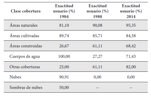 Dadas las similitudes y diferencias entre las firmas espectrales construidas para cada tipo de cobertura, la exactitud global de clasificación y el Kappa obtenidos fueron de 77,92 % y 0,64 para 1984; 80,26 % y 0,70 para 1998; 84,38 % y 0,76 para 2014. Para el caso específico de las áreas naturales y las áreas cultivadas, la exactitud de usuario obtenida es superior al 80 % (Tabla 4) garantizando así la calidad de los análisis posteriores (Mas et al. 2010), especialmente para evidenciar la dinámica de los cambios entre este par de coberturas. Por el contrario, el bajo nivel de exactitud en la clasificación de los pixeles de áreas construidas, otras coberturas y cuerpos de agua incide en la calidad final y en la exactitud global de los mapas temáticos obtenidos.