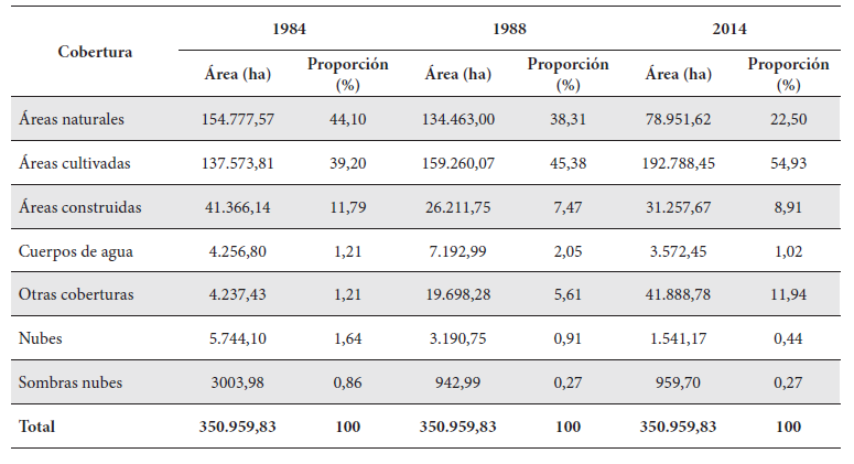Todas las coberturas (áreas naturales, áreas cultivadas, áreas construidas, cuerpos de agua y otras coberturas) muestran cambios en el periodo de estudio (Tabla 5). En el caso particular de las áreas naturales se observa una reducción cercana al 50 %, proceso asociado al aumento de las áreas cultivadas. Esta reducción es diferente para los subperiodos 1984-1998 y 1998-2014. En el primero la reducción de las áreas naturales fue del 13 % y en el segundo fue del 41 %; mientras que el aumento de áreas cultivadas para el primer subperiodo fue del 15 % y para el segundo fue del 21% (Error 29: La referencia: Tabla 5 está ligada a un elemento que ya no existe)