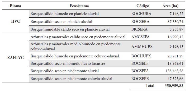 El primero se localiza en el piedemonte de la cordillera Occidental desde el centro hasta el sur del área de estudio, el segundo está en la parte norte y muy cerca de la influencia del río Cauca, el tercero se encuentra a lo largo del valle geográfico, el cuarto se ubica en la porción central del sur del departamento y muy cerca al río Cauca, y el último corresponde al área de influencia del río Cauca. Respecto a la proporción de las áreas de cada ecosistema frente al área total del área de estudio BOCSEPX posee el 13 %; BOCSEPA el 45 %; AMCSEPA el 5 % de esta región y BOCSERA cubre el 19 %. BOCSEPX inició el periodo de estudio con el 64,5 % de su área total con áreas naturales, y finalizó el 2014 con el 29,31 %, es decir, una reducción del 54 %; BOCSEPA presentó una reducción total del 45% y AMCSEPA una disminución del 73 % de su área natural en el periodo de estudio, siento este último el más alto del bioma ZAHTVC. En el caso de los ecosistemas del bioma HVC en BOCSERA la reducción fue mayor, siendo esta del 63 %.