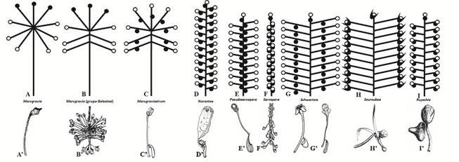 División y circunscripción taxonómicas. Esta familia está dividida en dos subfamilias, Marcgravioideae (la cual incluye solo el género tipo) y Noranteoideae, que está a su vez dividida en dos tribus, Ruyschieae con dos géneros, Ruyschia Jacq. y Souroubea Aubl., y Noranteeae, con los géneros Marcgraviastrum (Wittm. ex Szyszyl.) de Roon & S. Dressler, Norantea Aubl., Pseudosarcopera Gir.-Cañas, Sarcopera Bedell y Schwartzia Vell. (Ward y Price, 2002; Giraldo Cañas, 2011) (véanse la clave y las Figuras 1-10). La circunscripción morfológica de los géneros de la familia se presenta en la Tabla 1.