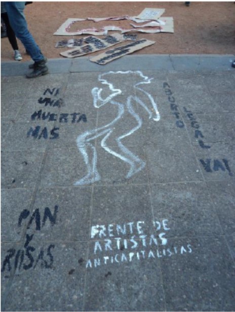 “Lo simbólico de estas siluetas sería porque cuando muere una mujer queda la silueta como una ausencia, y nosotras no queremos ni una muerta más. No queremos la ausencia de ninguna mujer en el país ni en el mundo que sea víctima de femicidio, de la trata de personas y que muera por aborto clandestino. Las muertas por aborto son víctimas de femicidios. Estas siluetas las planteamos como la memoria y el no olvido. Así como no olvidamos a los 30.000 desaparecidos de la dictadura, tampoco debemos olvidar que mueren 300 mujeres por año por abortos clandestinos y la cantidad de femicidios que hay” (Entrevista a militante del Frente de Artistas Anticapitalista, Pan y Rosas, 29º Encuentro Nacional de Mujeres, Salta, octubre de 2014).