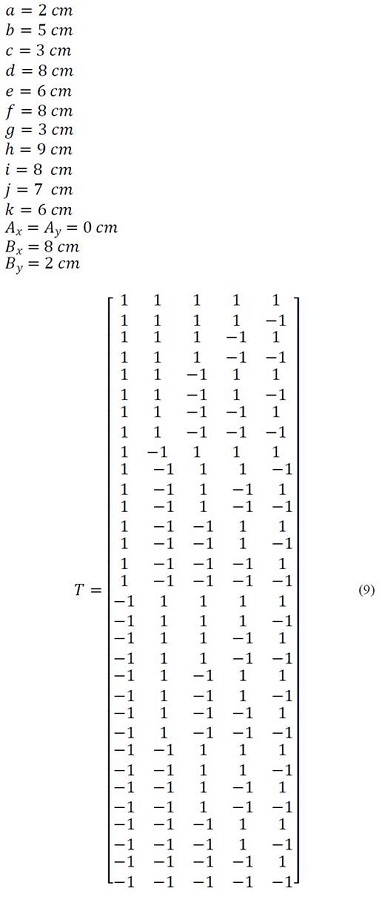 son 1 o -1, lo que significa que cada triángulo tiene dos configuraciones y, por lo tanto, el mecanismo tiene 32 configuraciones en total. Las configuraciones se pueden agrupar en una matriz de configuraciones 𝑇 ec. (9), donde cada fila representa la configuración 𝑇 𝑖 y las columnas de 𝑇 𝑖 son los valores de 𝑡 𝑗 .