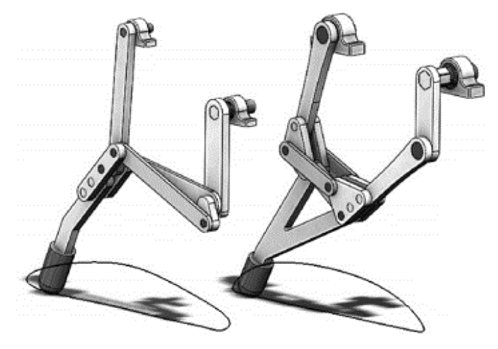 El mecanismo de Stephenson, conocido con en este nombre en honor a su inventor, es un mecanismo más complejo y complicado de analizar, si se le compara con un mecanismo de cuatro barras o uno de Watt [1]. Aunque este mecanismo ha sido menos estudiado que el mecanismo de cuatro barras, actualmente se encuentra un número considerable de trabajos sobre su modelaje matemático y computacional, así como de sus aplicaciones. Dentro de estas publicaciones, en las últimas dos décadas se puede destacar, el trabajo de Dewen Jin et al [2], donde se propone un método de diseño óptimo de un mecanismo de seis barras de Stephenson para una prótesis de miembro inferior, analizando sus ventajas, tanto del punto de vista cinemático, como dinámico. El trabajo de A. Hernández et al. [3], donde se describe un método geométrico iterativo para la solución de la cinemática de posición de mecanismos planos con pares rotativos, en los que se incluye el mecanismo de Stephenson. Wen-Yeuan en [4], trata un mecanismo de Stephenson como un mecanismo de cuatro barras o como un mecanismo de cinco barras con único circuito, para identificar la condición de rama. El concepto de relación geométrica o el hecho del determinante de la matriz jacobiana ser cero, fue propuesto para discutir las condiciones límites de la barra de entrada. También, Ana de Juan et al [5], presentan la aplicación informática DISMEC, desarrollada en el entorno MATLAB®, para el diseño cinemático de mecanismos. Esta aplicación es un complemento docente en la asignatura de Cinemática y Dinámica de Máquinas impartida en el plan de estudios de Ingeniero Industrial de la Universidad de Cantabria. Aquí el alumno puede seleccionar un mecanismo de la librería predefinida y definir la geometría y los parámetros de entrada del mismo. Los resultados se muestran de una forma gráfica, y mediante animaciones se consigue simular el movimiento real que tendría el mecanismo. La importancia de este trabajo es que se puede analizar casi cualquier mecanismo, ya que las soluciones son conseguidas de forma numérica, lo que hace posible tratar el problema de síntesis de trayectoria de un mecanismo de Stephenson tipo I en un menor grado de dificultad, consiguiendo una trayectoria aproximadamente recta para cinco puntos de precisión. En Mark M et al. [6], proponen un método para la síntesis de trayectoria con once puntos de precisión, en un mecanismo de Stephenson, donde las ecuaciones que describen matemáticamente la cinemática del mecanismo, están basadas en la condición de cierre de lazo vectorial. Allí el mecanismo tiene como aplicación la generación de la trayectoria de un pie para la marcha de un cuadrúpedo, como se muestra en la Fig. 1. También Mark M. et al [7], proponen un procedimiento para el problema de la síntesis de generación de función para un mecanismo de Stephenson, convirtiendo dicho problema en la solución de un polinomio.