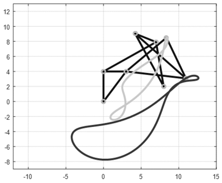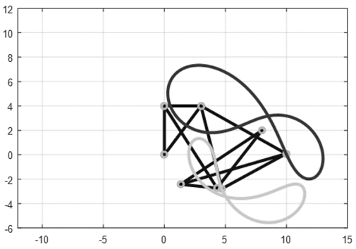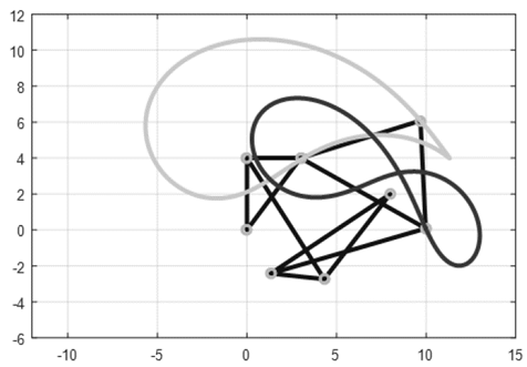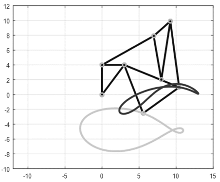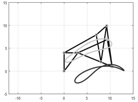 En las Figs. 4 a 13 se muestran las trayectorias de puntos del acoplador para las primeras diez configuraciones, evidenciando que las trayectorias son más complejas que las trazadas por un mecanismo de cuatro barras.