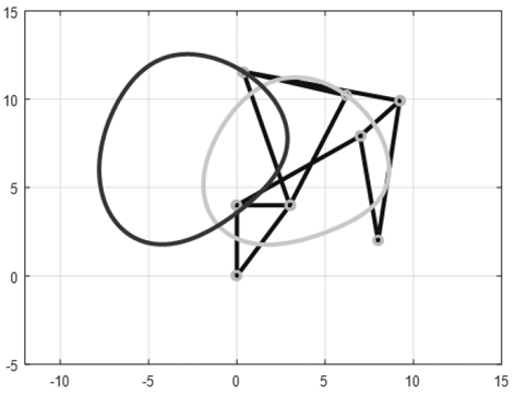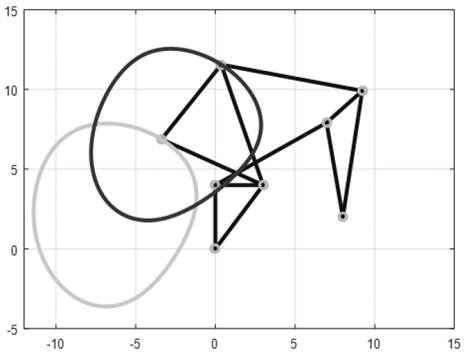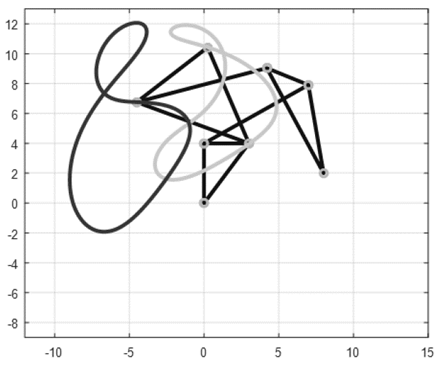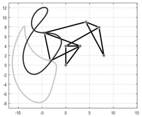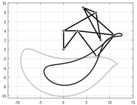 Las curvas trazadas por el mecanismo corresponden al punto 𝐺 y al punto 𝑃, teniendo en cuenta que el punto 𝑃 tiende al punto 𝐺 cuando la distancia 𝑘 se hace considerablemente pequeña. Estas curvas son más complejas que en el mecanismo de cuatro barras, ya que el número de variables que definen la geometría es mucho mayor.