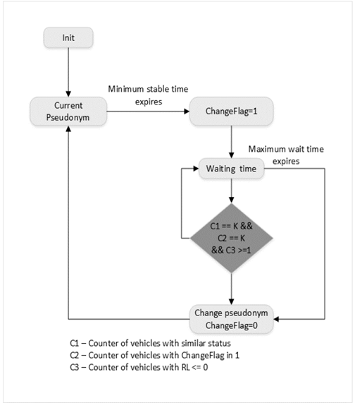 In the strategy based on the synchronous pseudonym change proposed in [6], the beacons add a change flag, to announce that the vehicle is ready to change its pseudonym. The vehicle uses a current pseudonym for a time of 60s, and then the algorithm enables the change flag in the communications to indicate to the other vehicles that it plans to change the pseudonym. The minimum time represents a reasonable value for position based routing. After this, the system enters a wait-check sub cycle where it remains until it fulfils the change condition. This condition involves a minimum number of K neighbour vehicles with the change flag enabled and similar status. If the previous condition is not fulfilled, the vehicle waits for a maximum time of 60s to change the pseudonym. In this way, the system guarantees a minimum time of change between two pseudonyms.