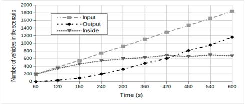We selected a scenario built in the iTETRIS ("An Integrated Wireless and Traffic Platform for Real-Time Road Traffic Management Solutions") project [44]. The given data included representations of the areas around the "Andrea Costa" and the "Pasubio" roads [45]. The scenario included the traffic demand for Bologna’s peak rush hour (8:00 am - 9:00 am) and the flow of vehicles in the scenario; in Fig. 2, 1843 vehicles enter the scenario, but not all them keep in it. In Fig 2, the line with squares represents the vehicles entering the scenario. The line with diamonds stands for the vehicles that going out to the simulated scenario. We see that the number of vehicles represented in these lines continues increasing minute by minute, and the number of vehicles going out is lower than the number entering. For these reasons, the line with triangles indicating the number of vehicles that stayed in the simulation is constant. It should be noted that about 600 vehicles per minute travel into the areas around the roads of the scenario.