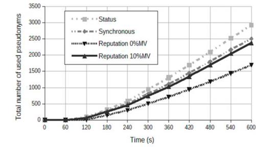 The status strategy obtained the highest number of used pseudonyms because this strategy is able to find the conditions needed to change the pseudonym more quickly. In contrast, in the case of the strategy of Rep with 0% MV where there was an absence of misbehaving vehicles, the strategy did not change the pseudonyms until the maximum waiting time expired, as we expected. The results of the reputation strategy with 10% of MV were close to the results of the synchronous strategy. The main reason is that the number of misbehaving vehicles is low. Only 10% of the cases the strategy found the conditions for pseudonym change, and one of their neighbours had a negative reputation.
